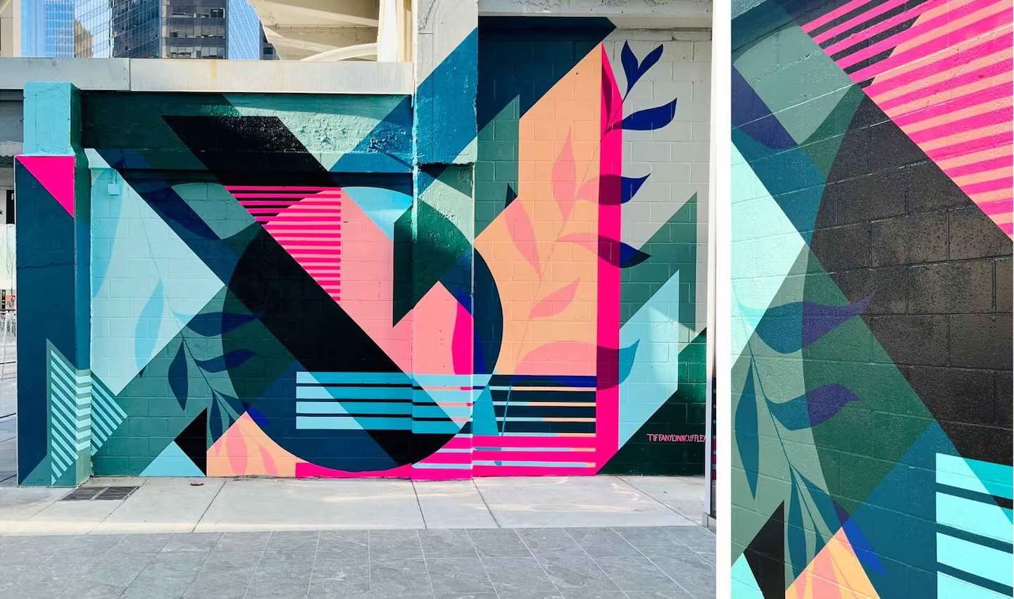 This mural was inspired by the shades and tones of dusk sunsets in Alberta. While the shape and design were influenced by sustainable architecture, encouraging harmony between human living and the natural world. The colours incorporated through the piece are tones of dusk and natural elements.
