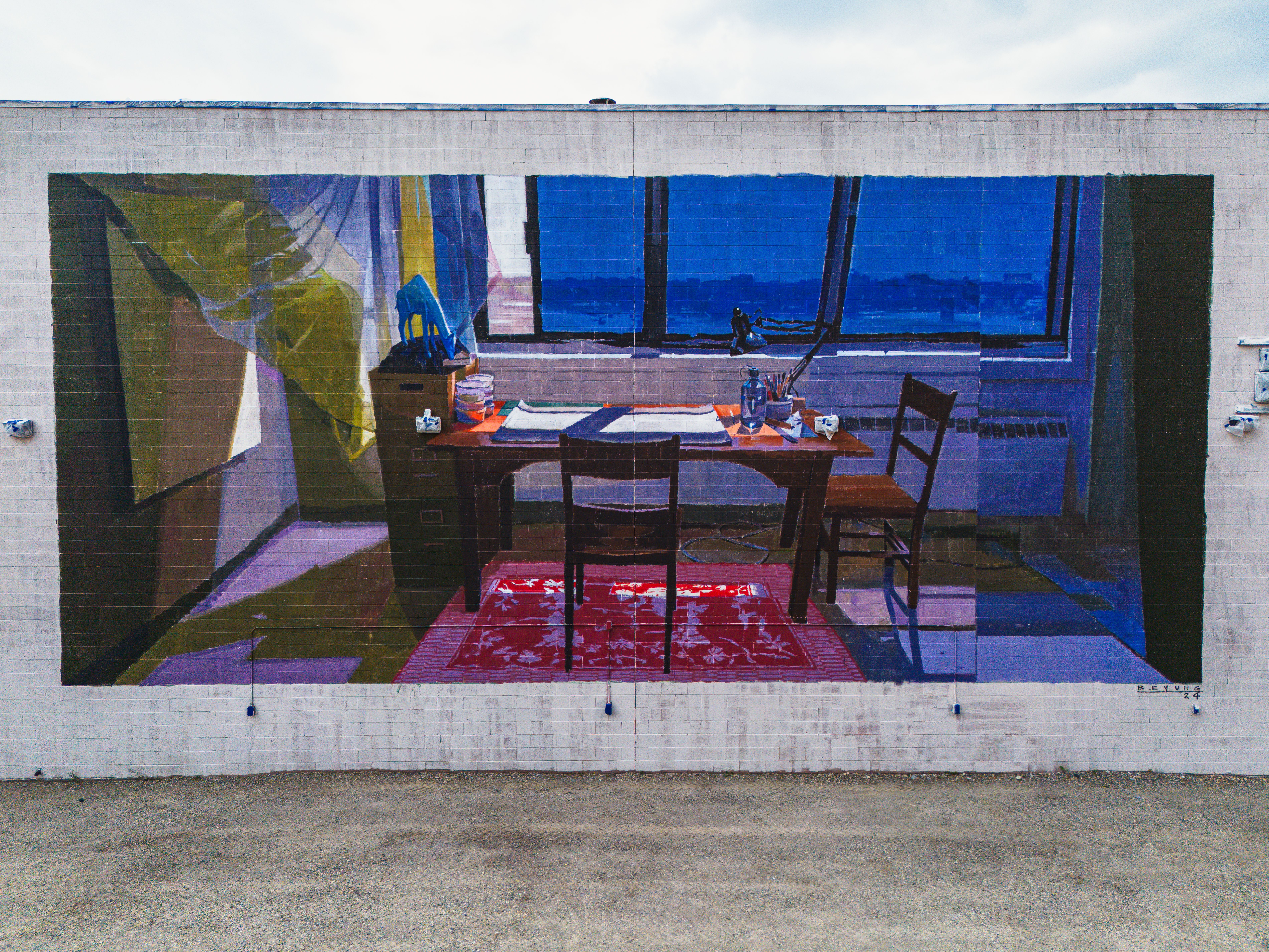 Est-une image tirée de mon local; l’idée était d’ouvrir une fenêtre sur ce lieu culte de la création. Les fenêtres (bleue vif) étant le regard vers le monde extérieur comme source d’inspiration. Je cherchais à ne pas représenter l’humain au sens figuré (comme demandé lors du brief) mais qu’on puisse tout de même sentir sa présence par la disposition des lieux et des objets (notamment les chaises) Il y a une atmosphère très intime lorsque nous peignons dans le studio. Et à l'inverse, lorsque nous peignons des œuvres murales et publiques nous nous mettons à nu. Il y a une répartition équitable de notre création et de notre vulnérabilité.