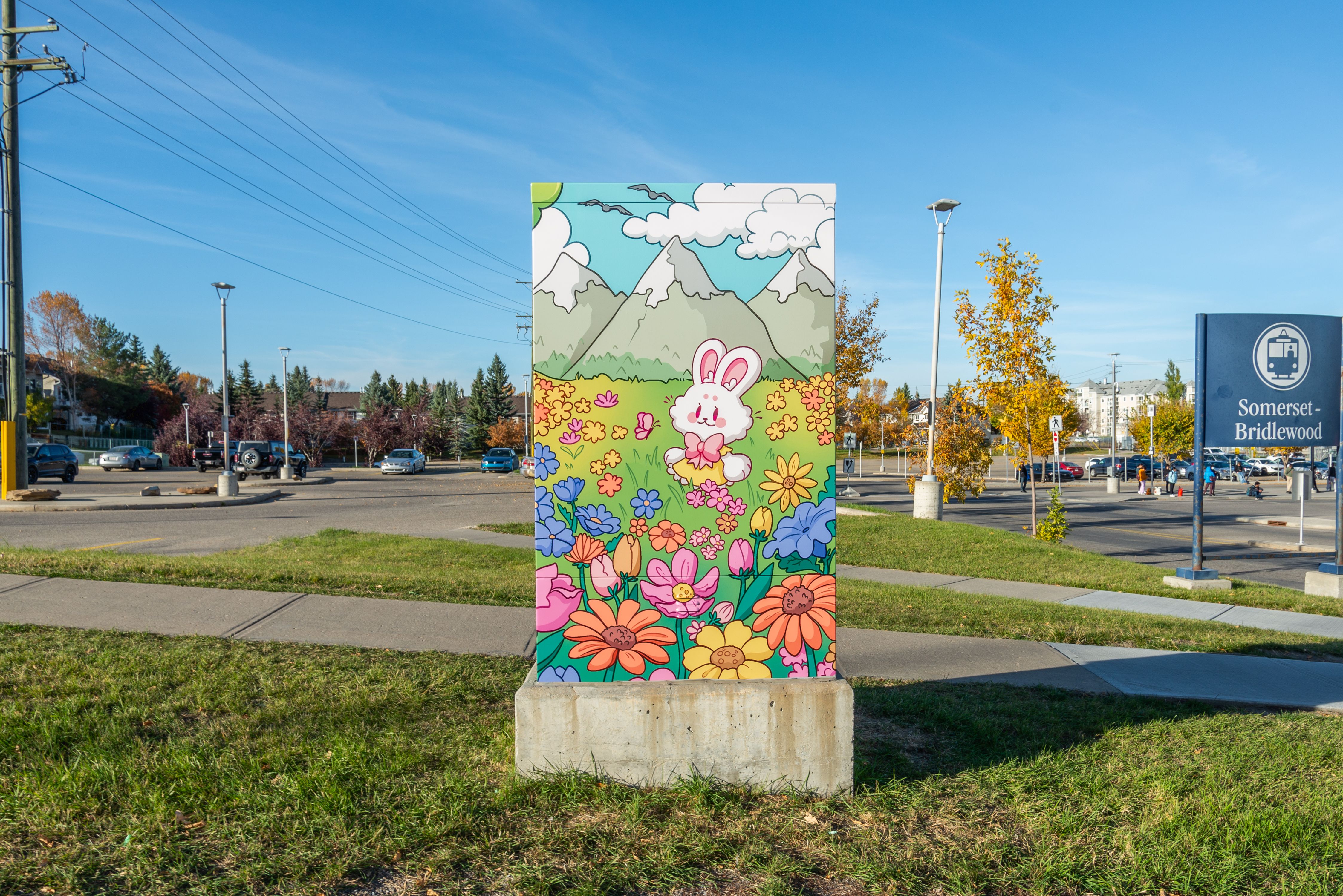 Being next to the train station, this space is where many people start and end their day. My goal was to create a fun and whimsical art piece that can bring something bright to people’s regular routine. In the flower field you can see some native plants like wild roses, goldenrods and coneflowers. As well as a rabbit and a fox — species also native to the area. The impact art has on people is instrumental in bettering quality of life. The goal is to represent and highlight these parts of the community and invite nature back into people’s day to day.