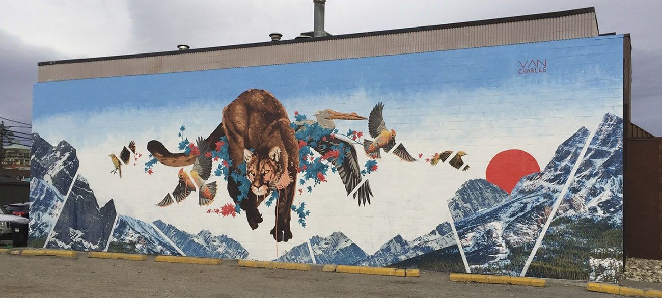 My artwork takes a days hike in nature, chops it up and remixes it with colored graphic shapes and patterns. Vast landscapes are created by collaging several digital images together. Acrylic paint is used in between each layer creating atmospheric depth. The result is a surreal and tangible sense of depth like what you would experience viewing diorama in a natural history museum. This depth combined with blue and gray undertones conjures feelings of being left alone and exposed in the deepest parts of the Canadian wild. In contrast, graphic shapes in the foreground are saturated with juicy warm colors inspired by our urban surroundings offering familiarity and a certain charm. Selected wildlife are the focal point of the composition often found moving in a celebratory and joyful way.