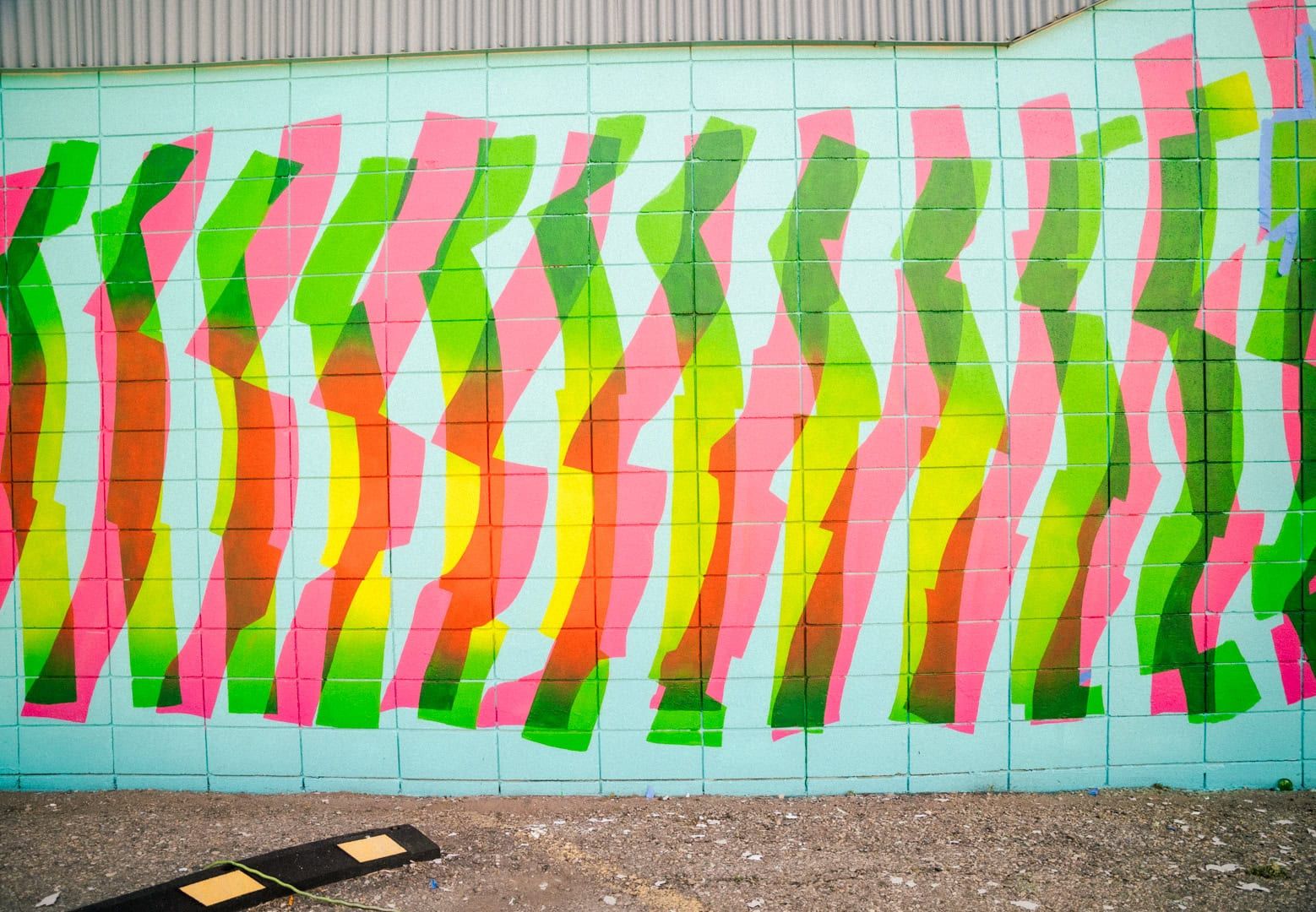 She states “Electric blues, greens, pinks, and oranges tether the mural to its digital inspirations. The soft translucent effect of the greens overlapping the pinks gives the form some breathing space and makes the piece appear to be flowing like sheer fabric.