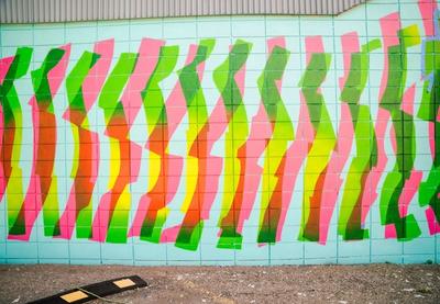 Electric blues, greens, pinks, and oranges tether the mural to its digital inspirations.