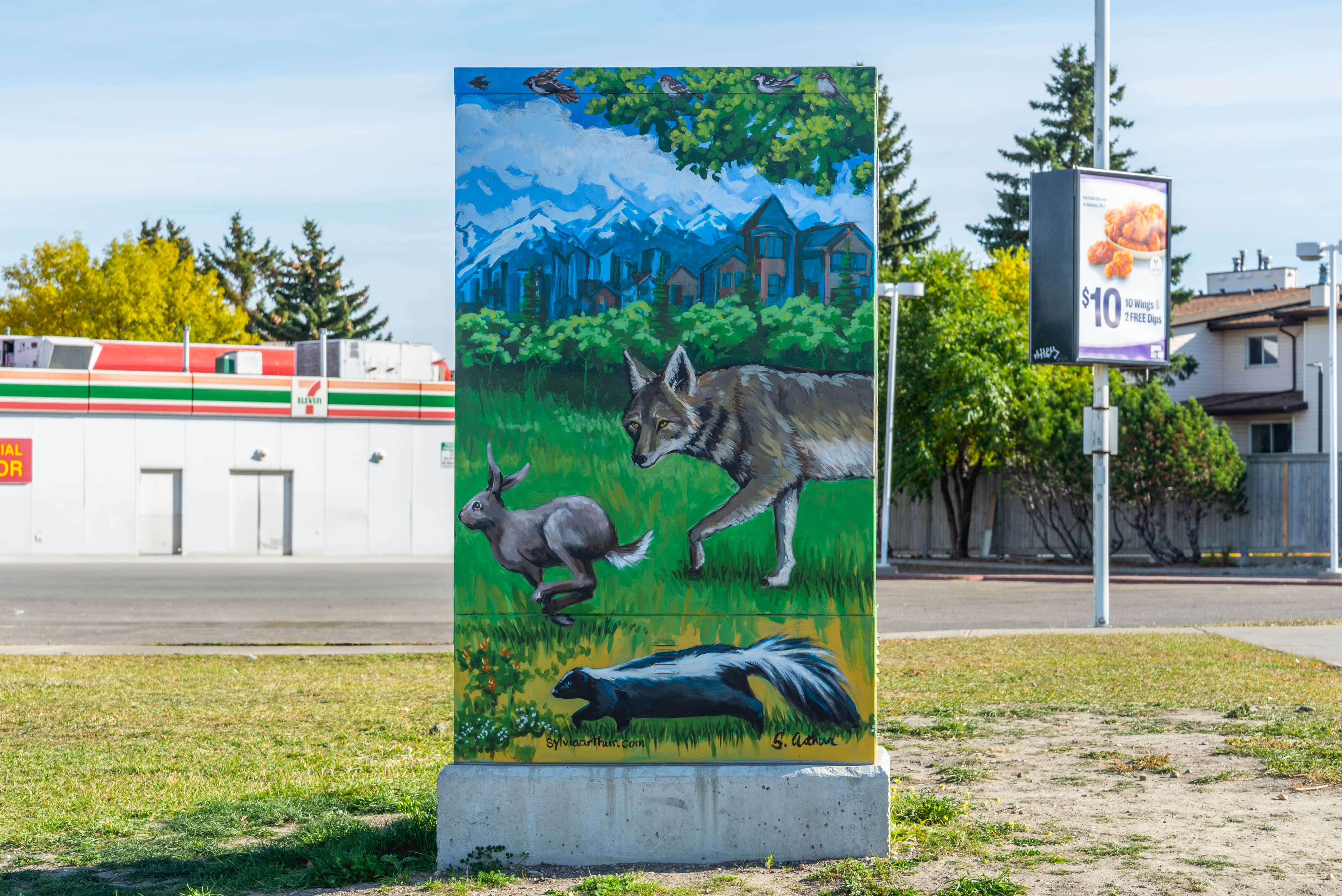 This artwork has evolved based on the community engagement. For the nature themed utility box Sylvia worked with community to find neighbourhood specific suggestions of flora and fauna that exist in Forest Lawn.