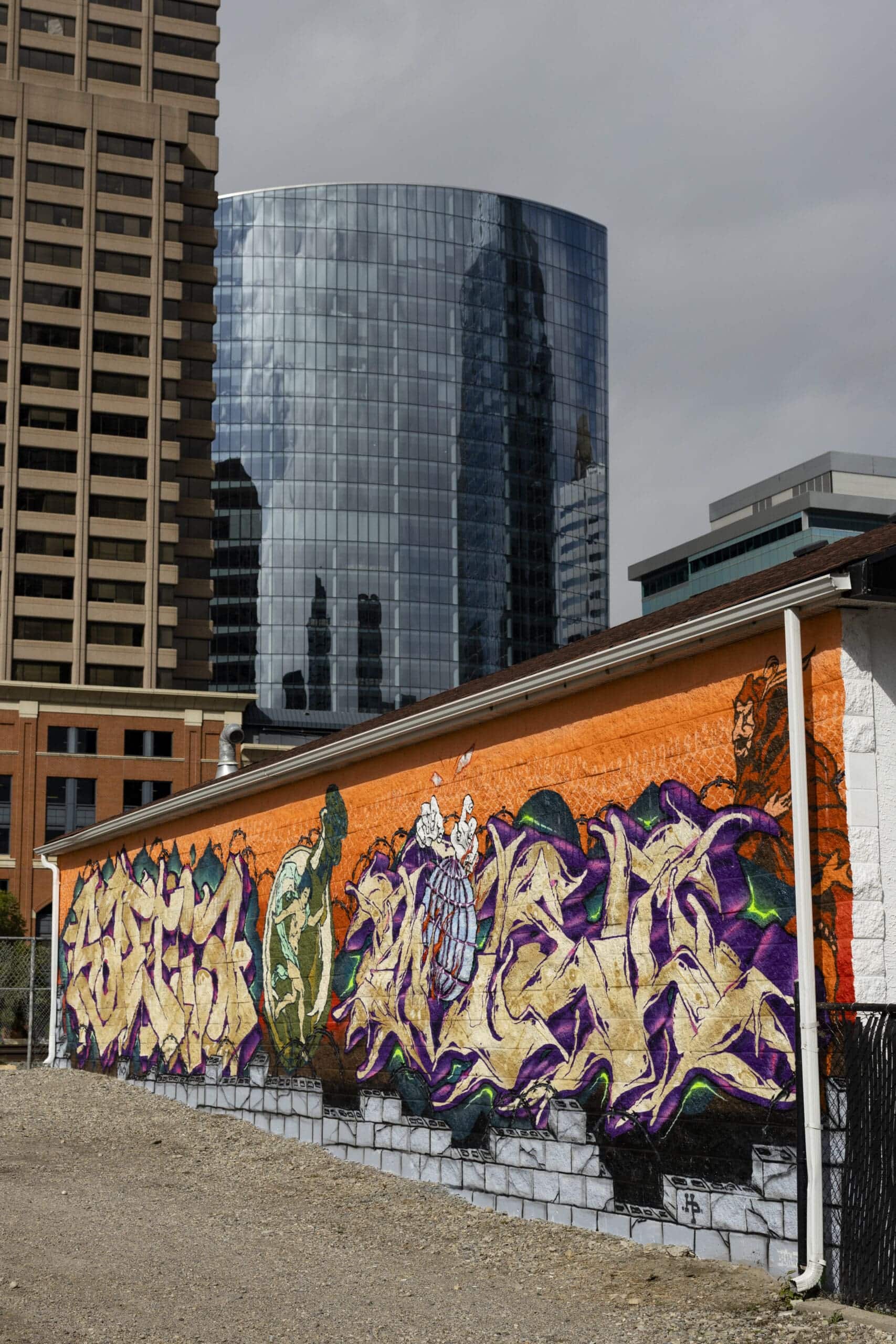 I wanted to stay true to my graffiti roots and produce work that embraced traditional graffiti culture. Graffiti paved the way for all forms of street art so representing it was very important to me. I included a “wizard” character that is trying to control a caged earth. This is a metaphor of otherworldly forces trying to control our destiny but inevitably struggling to maintain their hold (represented by fire). The right side of the wall displays a merchant type of figure. He represents the temptations we all face but need to have the strength to turn down. Centered on the wall is a person trapped in their ways. The fence and barbed wire was inspired by the adjacent train yard.