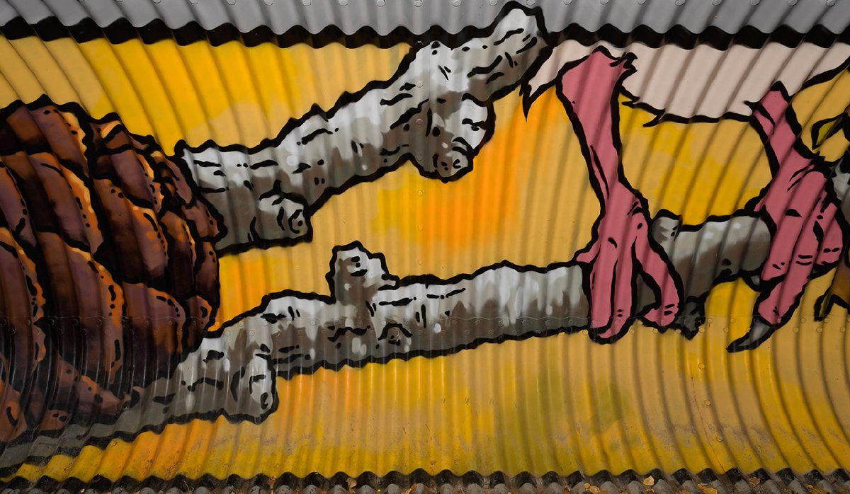 These spray painted murals were part of the Street Art Program for Youth and can be found in the pedestrian underpass at Confederation park. The corrugated steel surface of the tunnel has a distortive effect on images - the 'scenes' from the park reveal themselves only at certain angles, otherwise they are rendered as abstract bursts of colour. Up close, rosehips can seem alien as asteroids (or giant meatballs, as one young passerby quipped). These views of the park are intended to encourage us all to pay close attention to the world around us, and to take a few steps back every once in a while to gain some perspective.