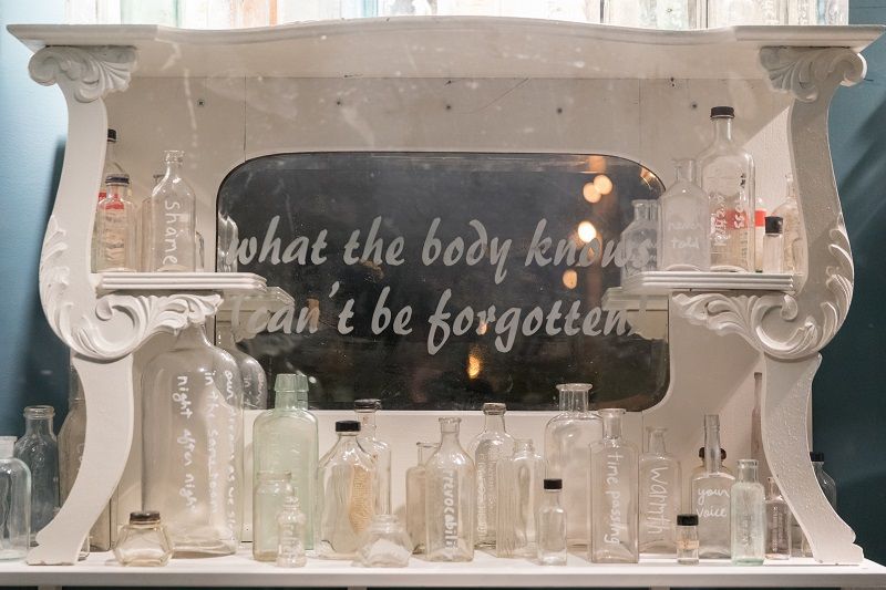 A visualization of the body as a vessel for narrative – as when an emptied bottle becomes a device for encapsulating messages of greatest urgency and intimacy, conveying them through the elements, across the sea. Installed in a vitrine on the South side of Chumir Health Centre are three long shelves, crowded with antique glass medicine bottles and the messages they bear. Ranging from clear to milky to iridescent, these old bottles provide the vehicle for fragments, secrets and stories – shuttling between thresholds. Mirrors, both aged and new, line the back of the vitrine, imparting intermittent messages through the glass bottles that have been placed as intermediaries between text and viewer - an effect which could alternately cloud or magnify our comprehension.
