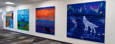 Known to the Sarcee, Tsuut’ina Nation as Wolf Creek, the panels showcase the changing seasons and connection to the animals, land, sun and moon, ceremonies, and traditional medicines of the area.