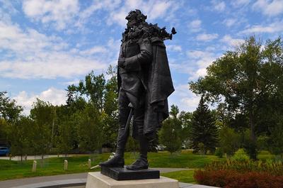 "Wolfe and the Sparrows" is a cast bronze sculpture inspired by an existing statue of General James Wolfe, sculpted by John Massey Rhind in 1898.