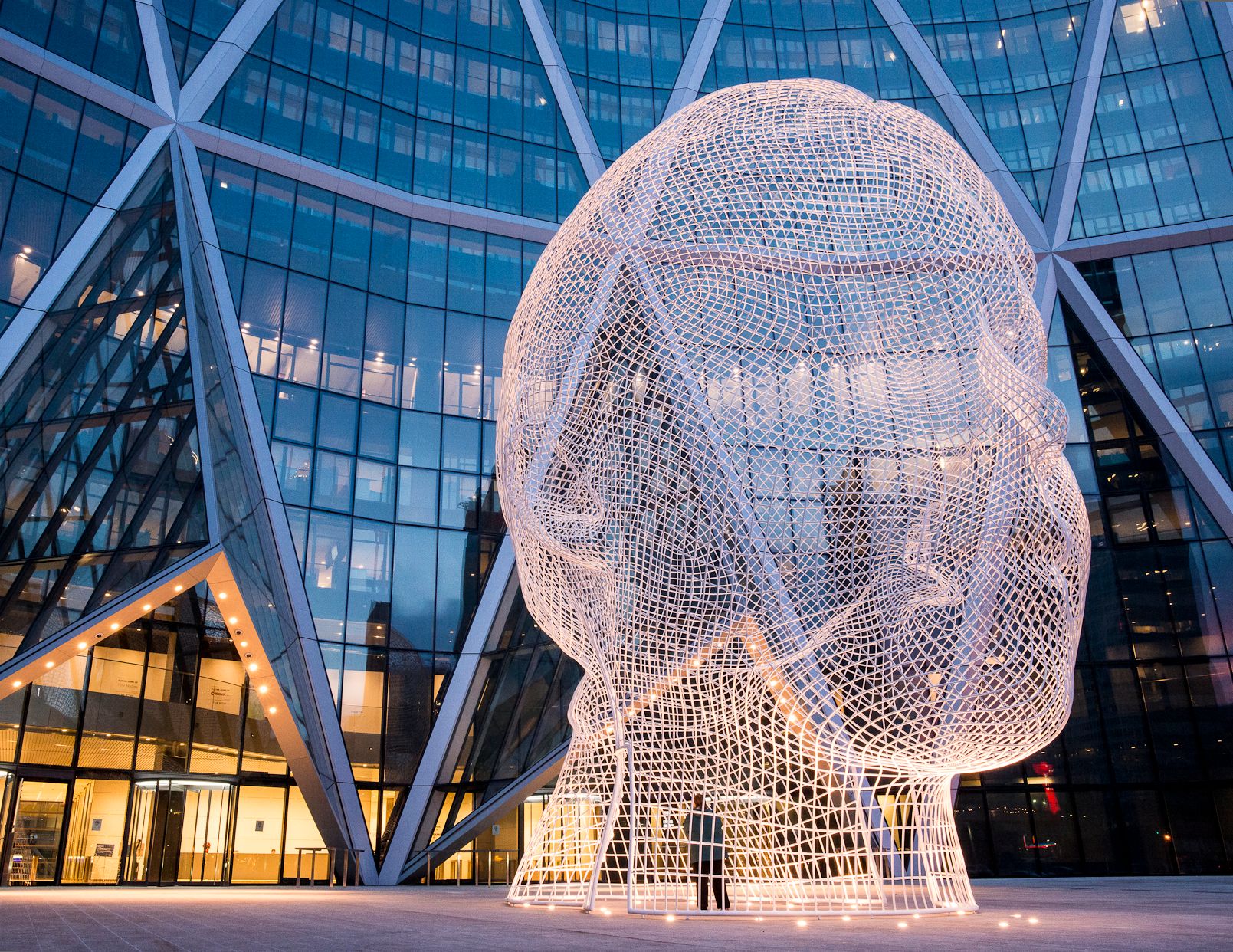 Wonderland is the portrait of a young girl who lives in the artist's native Barcelona. Depicting only her head, the portrait represents humanity as well as our human potential created and fostered by our dreams. The transparent mesh creates a visual bridge between Wonderland and THE BOW as Plensa strives to link together art, architecture and society. Contrary to its commanding size, the sculpture's transparency creates an ethereal sense of fragility, mirroring and celebrating the fragility of human beings. People are encouraged to enter the sculpture through openings on either side of the head, an invitation for visitors to physically experience Plensa's metaphor of the mind being the sanctuary for dreams.